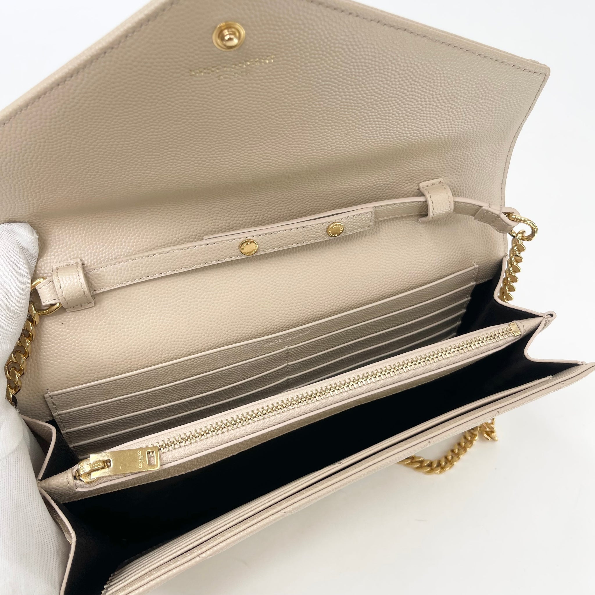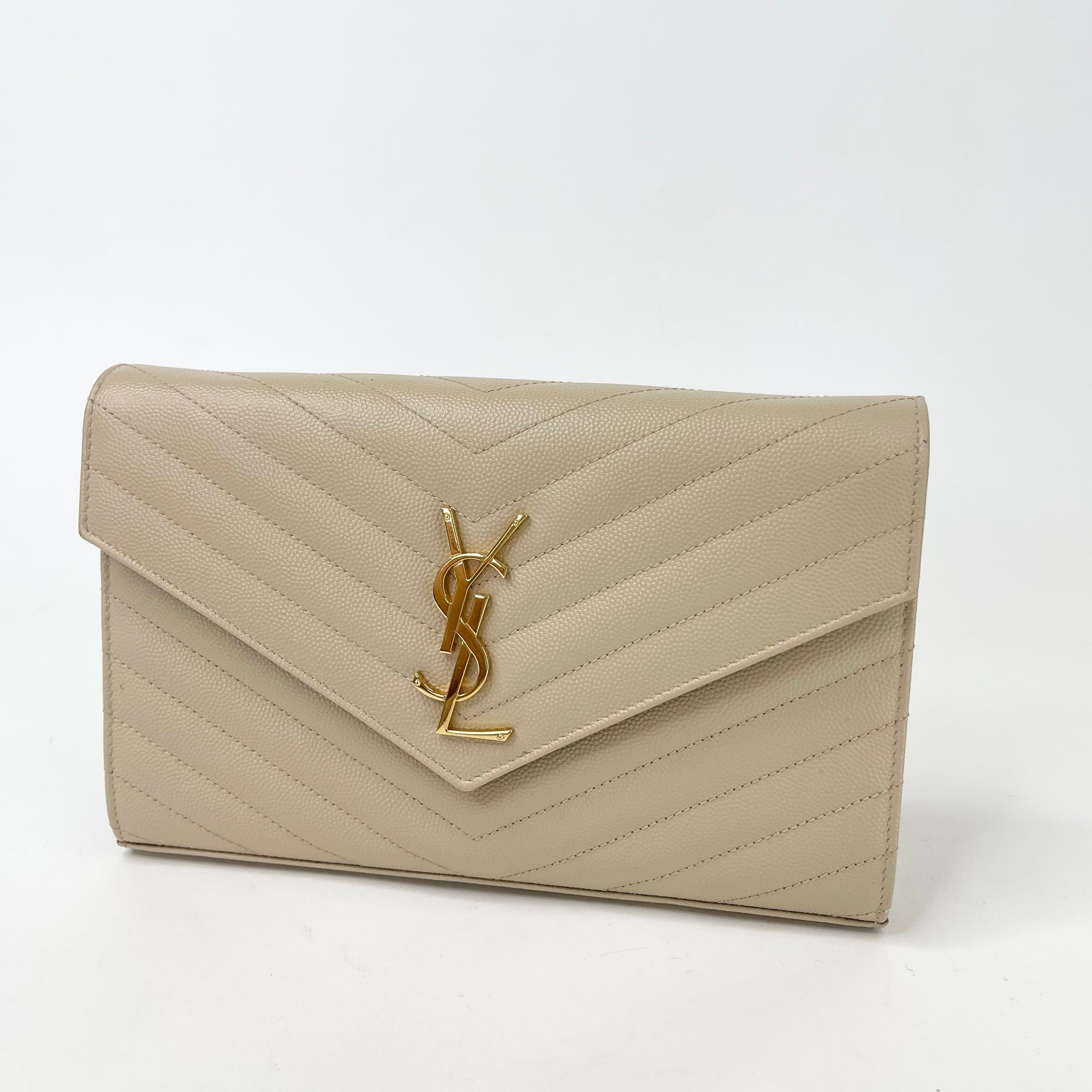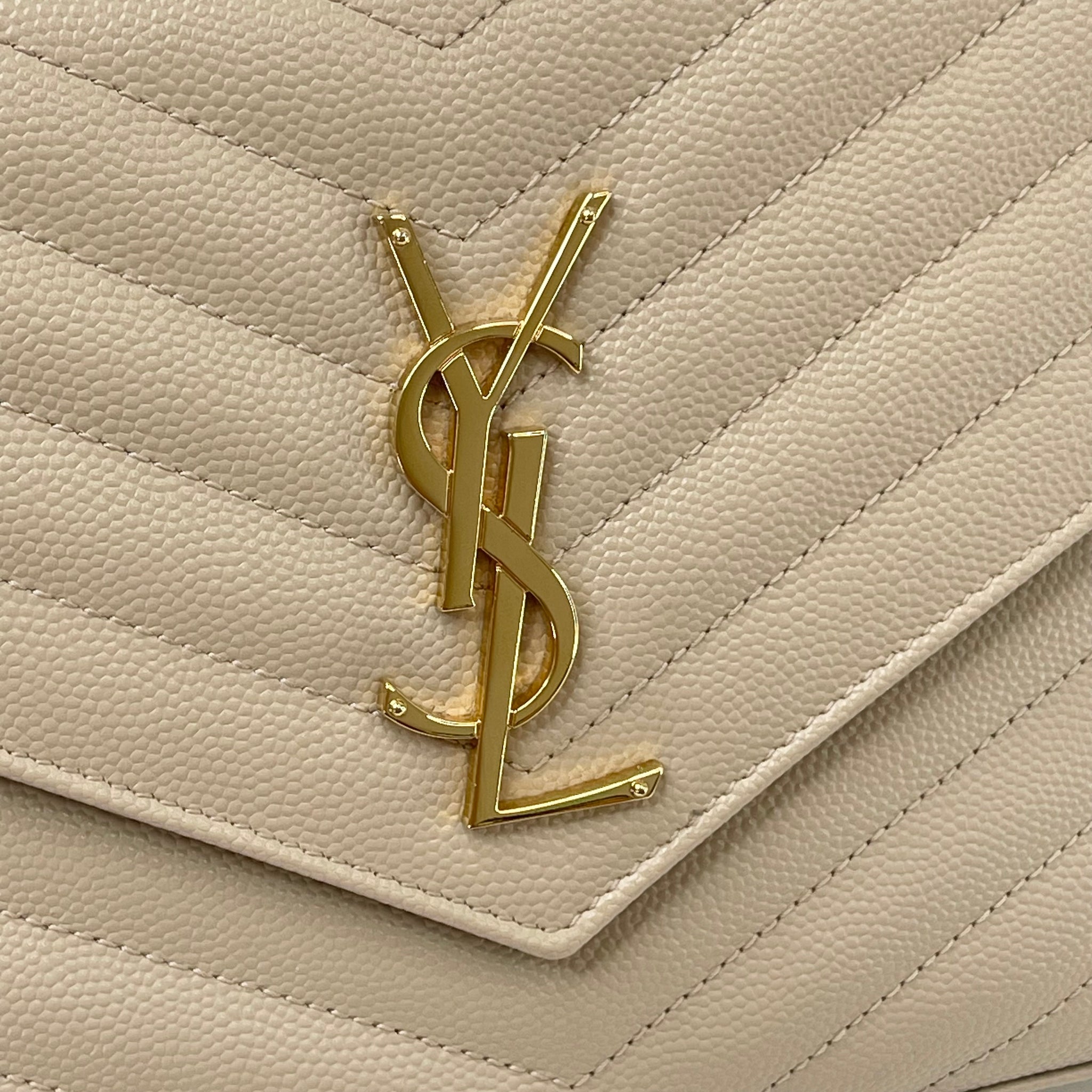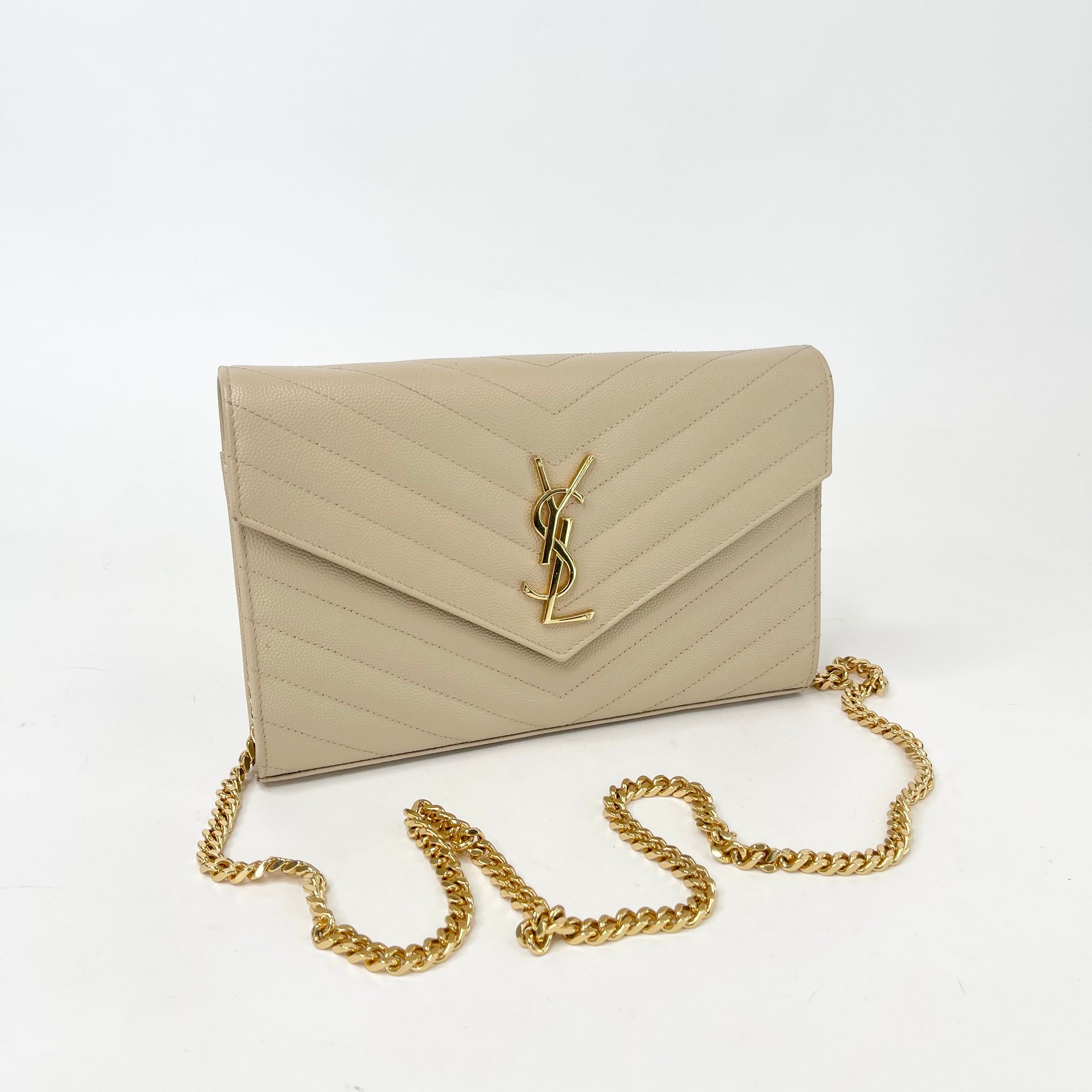 SAINT LAURENT CASSANDRE CHAIN WALLET/ CROSSBODY IN BEIGE GRAIN DE POUDRE LEA & GHW