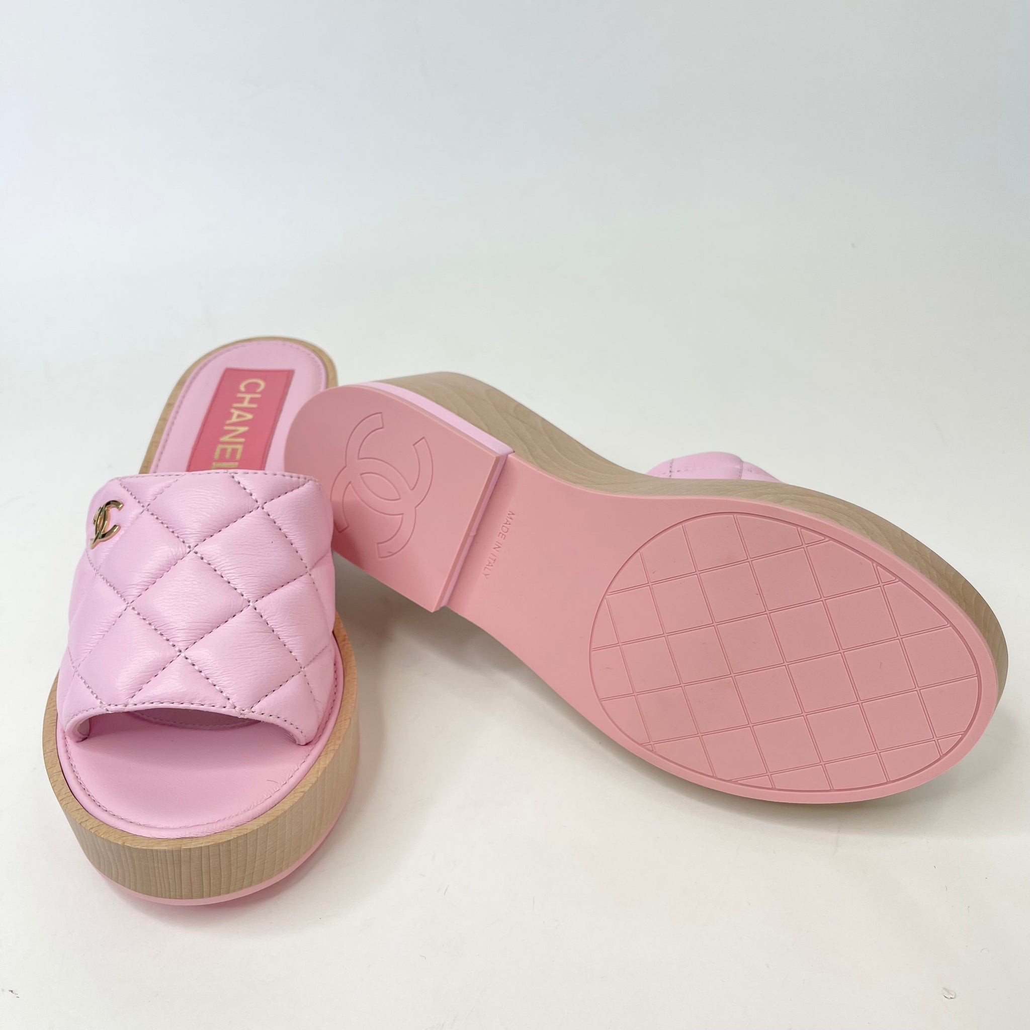 CHANEL PINK QUILTED LEA & WOOD SLIDES SZ 38
